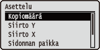 –9999![]() | Tulosteen ulkoasuasetukset, kuten sidontareunusmarginaalit ja tulostuskohdat, luetellaan lyhyiden kuvausten kanssa. Oletusasetukset on merkitty tikarilla ( ). |