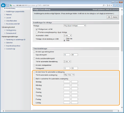 Du kan konfigurera enehten så att den automatiskt slås AV om den inte har använts under en lång tid. Du kan även konfigurera att enheten ska slås PÅ vid en viss tid. Med dessa funktioner kan du unvika att energi slösas för den händelse att någon glömmer att slå AV enheten. Den här funktionen är aktiverad som standard.