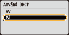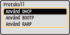 3 | Välj <Använd DHCP>, <Använd BOOTP> eller <Använd RARP> och tryck på . Du kan endast använda ett av protokollen DHCP, BOOTP och RARP. Om det valda protokollet anges till <På> anges de två övriga protokollen automatiskt till <Av>. |