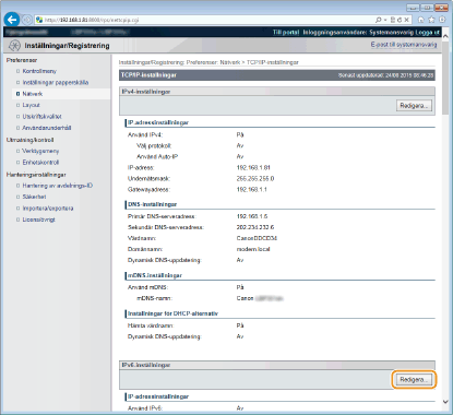 Kontrollera om inställningarna är rättKontrollera att skärmen Fjärranvändargränssnittet kan visas med datorn genom att använda enhetens IPv6-adress. Starta Fjärranvändargränssnittet Välja inställningar från kontrollpanelenDu kan även aktivera och inaktivera IPv6-adresser på kontrollpanelens inställningsmeny. IPv6-inställningar Om du har bytt IP-adress efter installationen av skrivardrivrutinenDu behöver lägga till en ny port. Konfigurera skrivarportar |