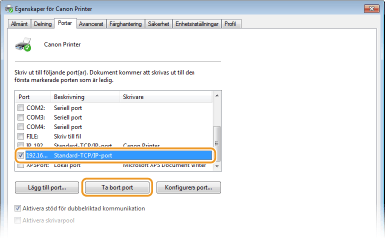 1 | Välj porten som du vill ta bort och klicka på [Ta bort port]. Du kan inte ta bort en port som är konfigurerad som aktiv skrivarport. Välj en annan port och klicka på [Verkställ] för att konfigurera den som den nya skrivarporten. Därefter kan du ta bort den ursprungliga porten. |
