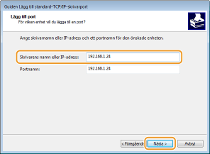 4 | Ange enhetens IP-adress eller DNS-namn och klicka sedan på [Nästa]. [Portnamn] anges automatiskt. Du kan ändra det om det behövs. När nästa skärm visas följer du anvisningarna på skärmen. *När du väljer [Enhetstyp] ska du välja [Canon Network Printing Device with P9100] under [Standard]. |