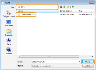 Ange mappen där skrivardrivrutinerna finns och välj INF-filen. Klicka sedan på [Öppna].