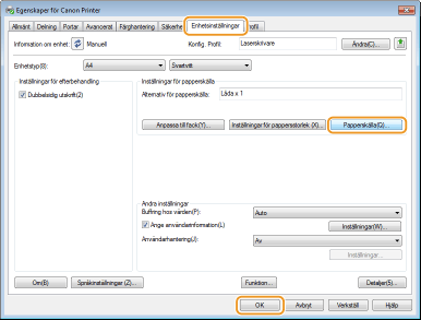 Gör på följande sätt i skrivardrivrutinen om den extra pappersmataren är ansluten till enheten.