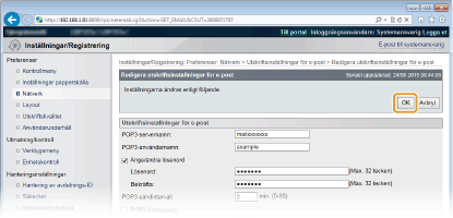 När du vill ange ett lösenord för att ansluta till e-postservern markerar du kryssrutan och anger det med alfanumeriska tecken i textrutan [Lösenord]. Ange samma lösenord som bekräftelse i textrutan [Bekräfta].