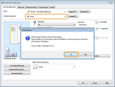 Välj [Lagra] i [Utmatningsmetod] och klicka på [Ja].