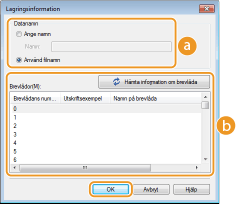 [Brevlådor]Platsen på SD-kortet där utskriftsdata sparas kallas för brevlåda. Välj numret på brevlådan där dokumentet ska sparas. Du kan tilldela brevlådan ett namn för att det ska vara lättare att identifiera den.