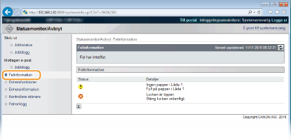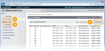Statusen för alla utskriftsjobb visas oavsett inställningarna i Hantering av avdelnings-ID. Fabriksinställningarna förhindrar att vissa åtgärder, t.ex. radera ett dokument som ska skrivas ut eller avbryta en utskrift, utförs i läget för allmänna användare. Om du vill hantera dokument i allmänt användarläge loggar du in i systemhanteringsläge och aktiverar [Tillåt allmänna användares jobbåtgärd]. Tillåta slutanvändare att hantera dokument Om du angett ditt användarnamn när du loggat in i allmänt användarläge visas bara användarnamnet i dina dokument som du skrivit ut. Klicka på [Jobbnr] i pausade och säkra dokument om du vill visa detaljerad information. Du kan kontrollera användarnamn och sidantal för utskrivna dokument. |