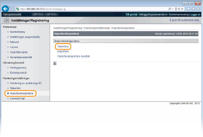 Läs in (importera) data som exporterats från enheten. Du kan även importera inställningar från en annan enhet om det är samma modell som din enhet.