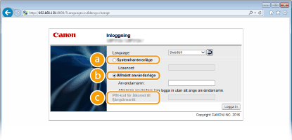 Välj [Systemhanterarläge] eller [Allmänt användarläge] och ange ett värde i [PIN-kod för åtkomst till fjärrgränssnitt] om det behövs.
