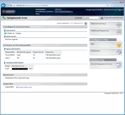 [Systemhanterarläge]Du kan använda alla funktioner och inställningar i fjärranvändargränssnittet. Ange lösenordet för systemansvarig i [Lösenord].
