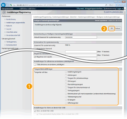 Du kan markera kryssrutan för att låsa en knapp även när den är nedtryckt på kontrollpanelen. Avmarkera kryssrutan för att låsa upp knappen. Du kan även låsa inställningsknappen från kontrollpanelen (