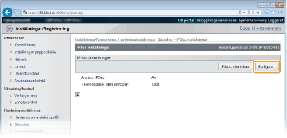Internet Protocol Security (IPSec eller IPsec) är en protokollsvit för kryptering av data som överförs över ett nätverk, däribland Internet-nätverk. Medan TLS endast krypterar data som används i ett visst program, t.ex. en webbläsare eller ett e-postprogram, krypterar IPSec antingen hela IP-paket eller nyttolasten i IP-paket, vilket gör IPSec till ett mer användbart säkerhetssystem. IPSec för enheten arbetar i transportläge där nyttolasten i IP-paket krypteras. Med den här funktionen kan enheten anslutas direkt till en dator som finns i samma virtuella privata nätverk (VPN). Kontrollera systemkraven och ställ in nödvändig konfiguration på datorn innan du konfigurerar enheten.