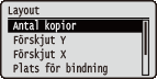till 9 999![]() | Inställningarna för utskriftslayouten, inklusive fästmarginaler och utskriftspositioner, visas med korta beskrivningar. Standardinställningarna är markerade med ett kors ( ). |