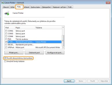 Na kartě [Porty] se ujistěte, zda je zaškrtnuté pole [Povolit obousměrnou komunikaci].