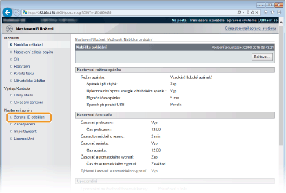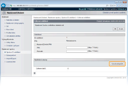 Vytištění výsledku kontrolyVymazání počtu stránek na nuluPokud chcete vymazat počtu stránek na nulu pro každé oddělení, klikněte na textový odkaz v části [ID oddělení] a klikněte na [Vynulovat počet]