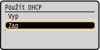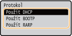 Můžete použít pouze jeden z protokolů DHCP, BOOTP a RARP. Pokud je vybraný protokol nastaven na <Zap>, další dva protokoly se automatiky nastaví na <Vyp>.