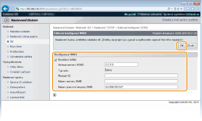 Při registraci přístroje na serveru WINS zadejte název pracovní skupiny, do které přístroj patří v síti SMB.