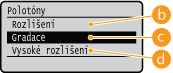 Implementace tisku s vyšším rozlišením než v nastavení <Rozlišení>; stabilita textury je mírně zhoršena. Tento režim tisku je vhodný pro ostrý tisk hran dat, například znaků, tenkých linek a CAD dat.