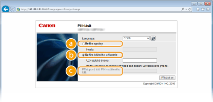 Vyberte možnost [Režim správy] nebo [Režim běžného uživatele] a podle potřeby zadejte hodnotu do pole [Přístupový kód PIN vzdáleného UR].