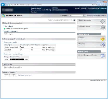Můžete zkontrolovat stav dokumentů či zařízení a také změnit některé nastavení.