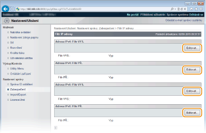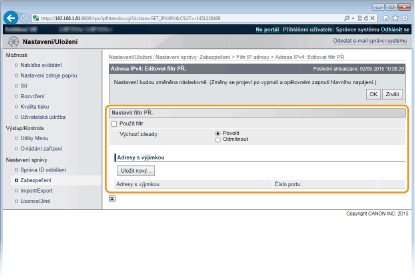 Pokud zadáte IP adresy nebo čísla portů nesprávně, nemusí být možné se k zařízení připojit prostřednictvím Vzdáleného uživatelského rozhraní. V takovém případě je třeba nastavit <Filtr adresy> na <Vyp>. Filtr adresy