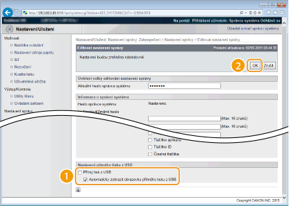 Zrušením zaškrtnutí zakážete přímý tisk z paměťového zařízení USB. Zaškrtnutím políčka povolíte tisk z paměťového zařízení USB. Pokud zaškrtnete i políčko [Automaticky zobrazit obrazovku přímého tisku z USB], automaticky se objeví obrazovka přímého tisku z USB, když se paměťové zařízení USB připojí k tiskárně.