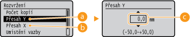 Můžete vybrat <Uprav. polohu tisku> v části <Uživatelská údržba> pro jemné zadání pozice tisku pro každý zdroj papíru. Rozsah dostupných hodnot přesahu je od -5,0 mm až +5,0 mm. Nastavení pozice tisku