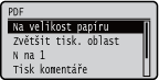 Všechna nastavení týkající se souborů PDF dostupných pro přímý tisk z USB a přímý tisk jsou uvedena s krátkým popisem. Výchozí nastavení jsou označena křížkem (