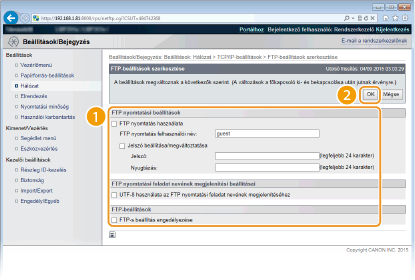 A jelölőnégyzet bejelölésével engedélyezheti a készülék beállításainak FTP kliensen keresztüli módosítását. Ha nem kívánja engedélyezni a beállítások módosítását, akkor törölje a jelet a jelölőnégyzetből.
