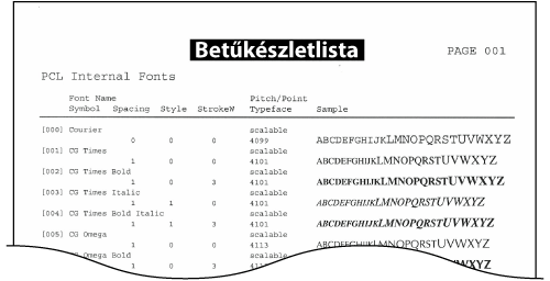 Lista formájában ellenőrizheti a PCL módban elérhető betűkészleteket.