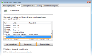 Nem törölhet olyan portot, amelyik jelenleg a nyomtatóportként van konfigurálva. A port törléséhez válasszon ki egy másik portot, majd kattintson az [Alkalmaz] lehetőségre az új nyomtatóportként való konfigurálásához, majd törölje az eredeti portot.