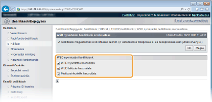 A WSD protokollon keresztüli nyomtatáshoz jelölje be a jelölőnégyzetet. Ha nem használ WSD-nyomtatást, akkor törölje a jelet a jelölőnégyzetből.