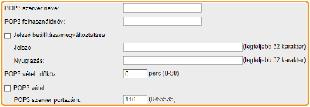 Állítsa be a levelezőkiszolgálóhoz való automatikus csatlakozás időközét, percben megadva. A levelezőkiszolgáló postafiókjába érkező új e-maileket a készülék a megadott időközönként automatikusan fogadja és kinyomtatja. Ezt a beállítást a kezelőpanel beállítás menüjének <POP3 vételi időköze> menüpontjában is megadhatja (