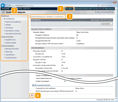 Megjeleníti a [Beállítások/Bejegyzés] oldalt. Ha rendszerkezelői módban jelentkezett be, akkor módosíthatja a beállításokat, illetve mentheti/betöltheti a regisztrált adatokat.