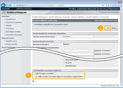 A jelölőnégyzetben lévő jel törlésével letiltja az USB-memóriaeszközről történő nyomtatást, a jelölőnégyzet bejelölésével pedig engedélyezi azt. Ha bejelöli az [USB közvetlen nyomtatási képernyő automatikus megjelenítése] jelölőnégyzetet is, akkor a közvetlen USB-nyomtatás képernyője automatikusan megjelenik, ha USB-memóriaeszköz csatlakozik a készülékhez.