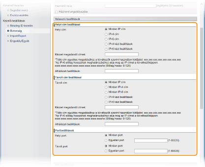 Ha az [IPv4 kézi beállítások] vagy az [IPv6 kézi beállítások] lehetőség van kiválasztva a [Távoli cím] mezőben, akkor adja meg azt az IP-címet, amelyre alkalmazni kell a házirendet.
