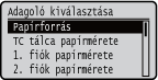 A <TC tálca - vegyes p.> beállítás <Be> értékre állítása esetén a papírt akkor is a papírfiókból adagolja a készülék, ha a <TC tálca prioritása> pont <Be> lehetősége van érvényben.