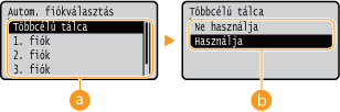 Általános beállításokA beállítások megegyeznek a Beállítás menü <Papírforrás> elemében található lehetőségekkel. Az itt megadott beállítások érvényesek a <Papírforrás> menüpont beállításaira is.