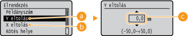 Az egyes papírforrásokhoz finomra hangolhatja a nyomtatási pozíciót a <Használói karbant.> pont <Nyomt.helyzet beáll.> elemében. Az eltolási értékek elérhető tartománya a következő: -5,0 mm...+5,0 mm. A nyomtatási pozíció beállítása