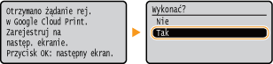 Urządzenie można zarejestrować również z urządzenia przenośnego lub z przeglądarki Google Chrome. Przed zakończeniem rejestracji na wyświetlaczu urządzenia zostanie wyświetlony poniższy ekran z potwierdzeniem. Wykonaj   <Tak>   , aby zakończyć rejestrację.