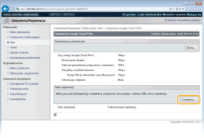 Należy uaktywnić technologię Google Cloud Print. Kliknij przycisk [Edytuj], zaznacz pole wyboru [Użyj usługi Google Cloud Print], a następnie kliknij przycisk [OK].