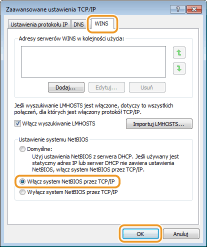 Kliknij kartę [WINS], wybierz opcję [Włącz system NetBIOS przez TCP/IP], a następnie kliknij przycisk [OK].