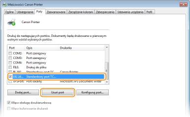 Nie można usunąć portu, który aktualnie jest skonfigurowany jako port drukarki. Aby usunąć ten port, wybierz inny port i kliknij przycisk [Zastosuj], aby skonfigurować go jako nowy port drukarki, a następnie usuń oryginalny port.