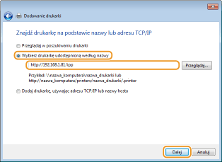 Aby użyć protokołu IPP, wprowadź wartość „http://<adres IP urządzenia>/ipp” dla lokalizacji docelowej połączenia.