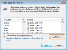 Aby ustawić protokół drukowania IPP lub IPPS, należy zainstalować sterownik drukarki, wykonując opisane poniżej czynności odpowiednio do systemu operacyjnego zainstalowanego na komputerze. Sterownik drukarki znajduje się na dysku User Software CD-ROM/DVD-ROM (Dysk CD-ROM/DVD-ROM z oprogramowaniem użytkownika) dołączonym do urządzenia. Przed rozpoczęciem wykonywania opisanych czynności, należy umieścić dysk User Software CD-ROM/DVD-ROM (Dysk CD-ROM/DVD-ROM z oprogramowaniem użytkownika) w stacji komputera.