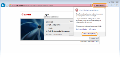 W przypadku korzystania z serwera DNS zamiast wartości „Adres IP urządzenia” należy wprowadzić „<nazwa hosta urządzenia>.<nazwa domeny>” (przykład: https://moja_drukarka.przyklad.com/).