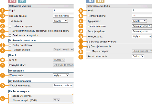 Ustawienia drukowania dla funkcji drukowania bezpośredniego