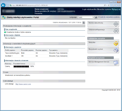Pozwala wykonywać wszystkie operacje i konfigurować wszystkie ustawienia w Zdalnym interfejsie użytkownika. Należy poprawne hasło menedżera systemu w polu [Hasło].