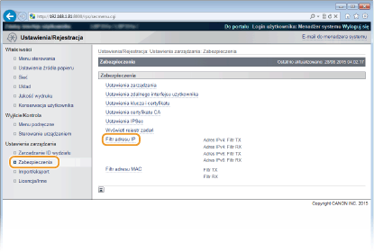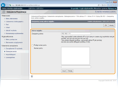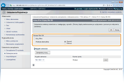 Nieprawidłowo wprowadzone adresy IP lub numery portów mogą uniemożliwić dostęp do urządzenia z poziomu Zdalnego interfejsu użytkownika. Konieczne będzie wtedy ustawienie filtra <Filtr adresów> na wartość <Wyłącz>. Filtr adresów